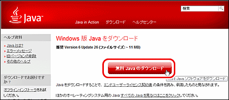 それ以外の場合は、[ダウンロード]をクリックして開いたページで、[無料 Java のダウンロード ] をクリックし、インストールを実行する。