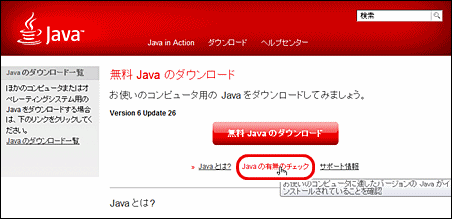 (1)無料 Java のダウンロードを開き、[Java の有無のチェック] をクリックする。