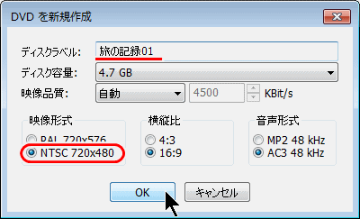 (2)”ディスクラベル”を入力し、”映像形式”で NTSC 720x480 をチェックし、