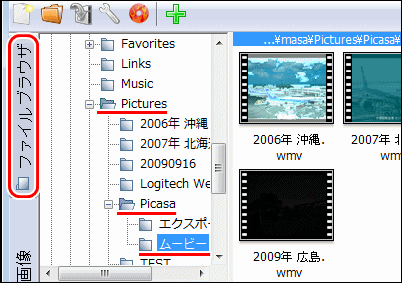 (4)[ファイルブラウザ]タブを選択し、動画ファイルのあるフォルダを選択する。