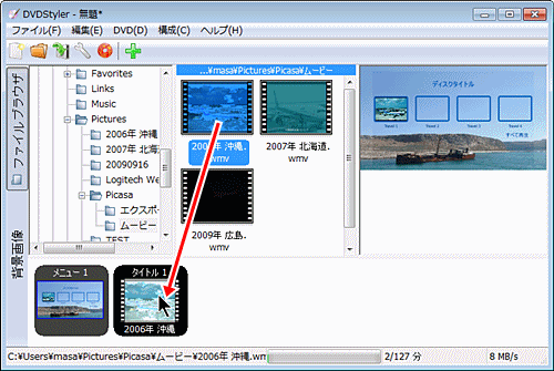 (5)中央に表示された動画ファイルから、DVDに焼くものを下の段にドラッグ&ドロップする。