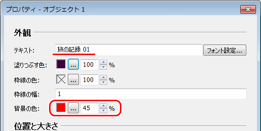 (8)[ディスクタイトル]をダブルクリックし、”テキスト”を入力する。文字の色、枠線の色、背景の色、枠のサイズを変更して、[OK] をクリックする。なぜか、テキスト中に全角スペースが含まれていると、それ以降の文字が表示されません。