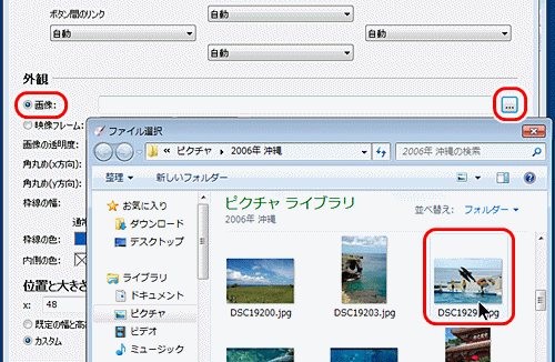 (10)枠の中の画像は、写真ファイルまたは動画ファイルの1フレームから選択できる。写真ファイルを使う場合は、画像をダブルクリックして、”外観”の