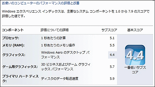 (3)評価が完了するには、数分かかる。評価結果の見方は、【@IT】Windows 7のエクスペリエンス・インデックス(WEI)でPC利用の「快適度」を測る の説明が詳しいです。