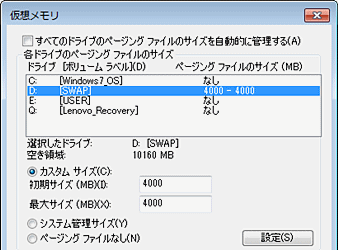 Dドライブはページングファイル用に、Eドライブはユーザデータ用に使用する。