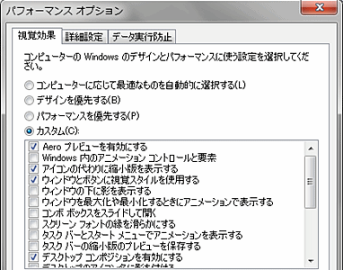 (3)[視覚効果]タブで、●カスタム にチェックを入れる。