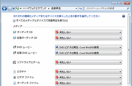 CDを入れたり、メモリカードを挿するたびにウィンドウが開き、どんな処理をするかを尋ねられるのが面倒な人向けの設定です。 また、USBメモリーを経由したウイルス感染が報告されているので、自動実行機能には危険が伴うとも言えます。