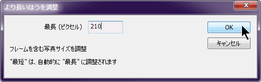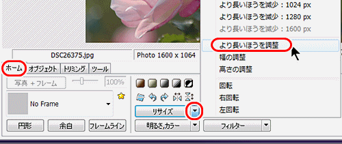 (2)写真を読み込み、[リサイズ]をクリックして、[より長いほうを調整]を選択する。