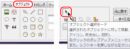 (2)イラストを編集するために、[オブジェクト]タブを選択し、[オブジェクト選択モード]をクリックする。