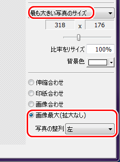 (3)8、9枚目のサイズが大きいので、[最も大きい写真のサイズ]、●画像最大(拡大なし)、写真の整理[左] を選択する。