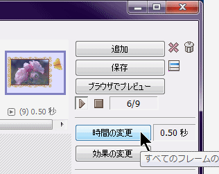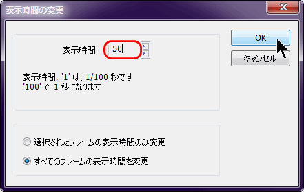(2)表示時間を入力(1/100秒単位なので、50ならば0.5秒)して、[OK] をクリックする。
