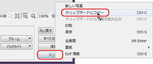 (1)画面右下の[メニュー]をクリックし、[クリップボードにコピー]を選択する。